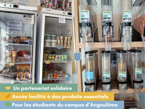 Grâce à ce soutien, les étudiants du campus d’Angoulême de l’Université de Poitiers bénéficient d’un accès facilité à des aliments frais de qualité, à des cagettes de fruits et légumes bio et locaux à prix réduits, ainsi qu’à des produits de première nécessité à l’Epicerie du Nil, gérée par le SCCUC.